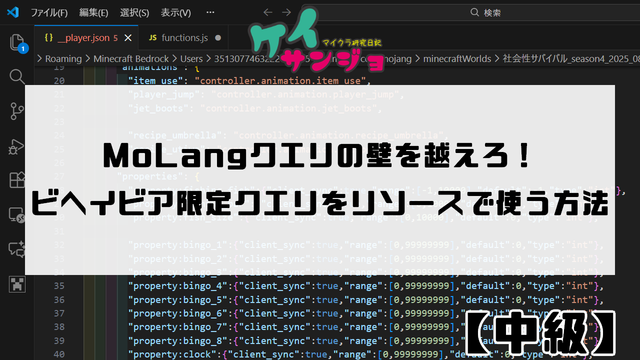 query)を使用し、animation_controllerやclient_entity(リソースの〇〇.entity.json)、animationなどを記述できること。 - JavaScriptを使ったScript APIの基本的な導入と動作が理解できること。